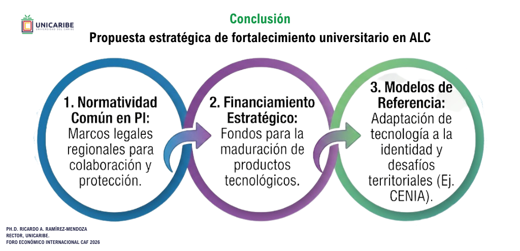 Como conclusiones del panel, se subrayó la necesidad de fortalecer la relevancia de las universidades de la región a partir de tres ejes prioritarios: avanzar hacia una normatividad común en materia de propiedad intelectual, promover esquemas de financiamiento estratégico orientados a la maduración de productos tecnológicos, y adoptar modelos de referencia exitosos adaptados a la identidad y los desafíos territoriales de América Latina y el Caribe.
