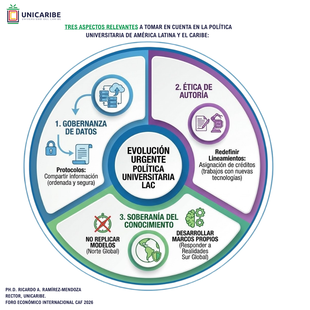 El Rector de la Universidad del Caribe (UNICARIBE), Ph.D. Ricardo A. Ramírez-Mendoza, señaló que en la actualidad las universidades de América Latina y el Caribe enfrentan el reto de trascender su rol tradicional ante la irrupción de la inteligencia artificial. Si bien la formación de talento y la investigación científica continúan siendo pilares fundamentales, persiste una inercia institucional que prioriza la divulgación y publicación casi automática de los resultados de investigación, sin una reflexión previa sobre la propiedad intelectual.